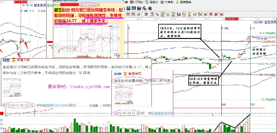 接下來,我們講下個(gè)股的實(shí)戰(zhàn)案例,這個(gè)股票就是益生股份,該股是在江恩時(shí)間窗口10月9日、10日放量突破站穩(wěn)江恩270度及極反通道生命線的,趨勢轉(zhuǎn)強(qiáng),符合跟蹤操作規(guī)則。因此在10月16日股價(jià)縮量回踩生命線時(shí)做了詳細(xì)的圖形展示,股價(jià)隨后啟動(dòng)拉升,并在10月25日時(shí)間窗口繼續(xù)加速封板,短短一周的時(shí)間已經(jīng)從最佳買點(diǎn)生命線上漲到階段減持點(diǎn)紅色線,單波利潤達(dá)到35%;如此巨大的上漲空間皆是因時(shí)間周期的精確預(yù)判而獲得??梢?,時(shí)間周期在個(gè)股分析交易中的巨大威力。