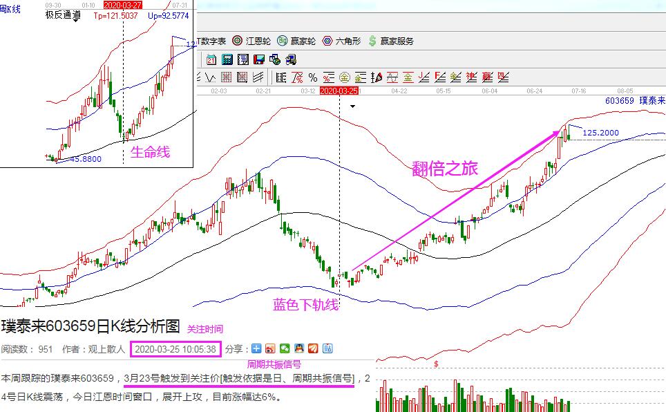 璞泰來和歌爾股份:這兩個票都是在3月底關(guān)注的,隨著大盤的一波下跌,不少績優(yōu)股也給出了更好的位置,其中,璞泰來在3月23日股價日線下跌至藍色下軌線附近,同時周線回踩到生命線,形成了超跌+最佳的周期共振信號;歌爾股份在3月24日股價下跌至藍色下軌線附近,同時周線回踩到生命線,同樣形成了超跌+最佳的周期共振信號。這兩個股票隨后都是展開了翻倍的行情,也都是非常經(jīng)典的周期共振的左側(cè)交易買入案例。