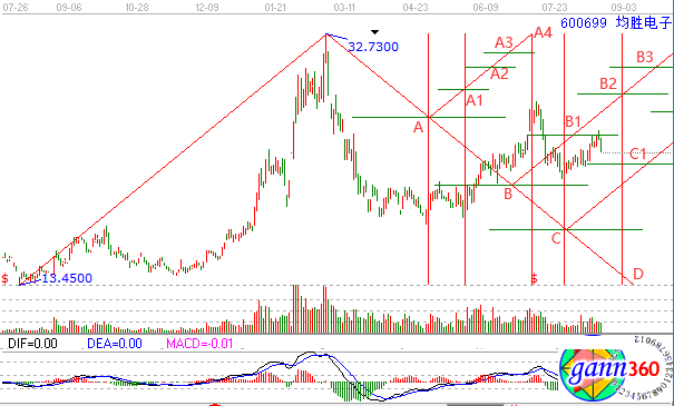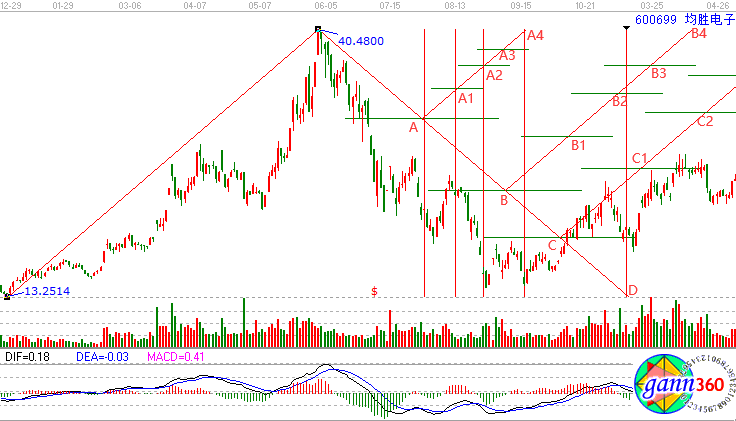 我們以2014年12月30日作為起點,2015年6月2日作為終點來進行作圖,圖中線段ABCD是主要趨勢線,所有字母標注的點位是可能發(fā)生趨勢轉折的點位,而這些點位所對應的時間也是重要的時間變盤窗口。上圖中A點是一波急跌的終點;A1是一波上的終點同時也是一波下跌的起點;A2是一波下跌的終點;A4是一波上漲的開始;D點是一波下跌的終點。