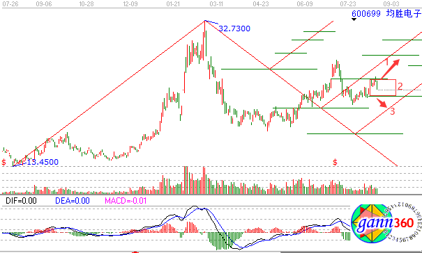 由于此次研究的時間周期跨度有一年多,因此在結果上可能會有幾天的小誤差,如果想要更加精確的分析,只需要研究更小的時間周期跨度就可以了。我們透過上面的研究分析可以得到,股票會沿著紅色斜線的方向運行,同時在趨勢轉折點位發(fā)生走勢的變化,并且會在綠色橫線的位置獲得支撐或者壓力。那么均勝電子未來會怎么走呢?下面我們就用這個工具來對600699均勝電子未來的走勢進行分析預測。
