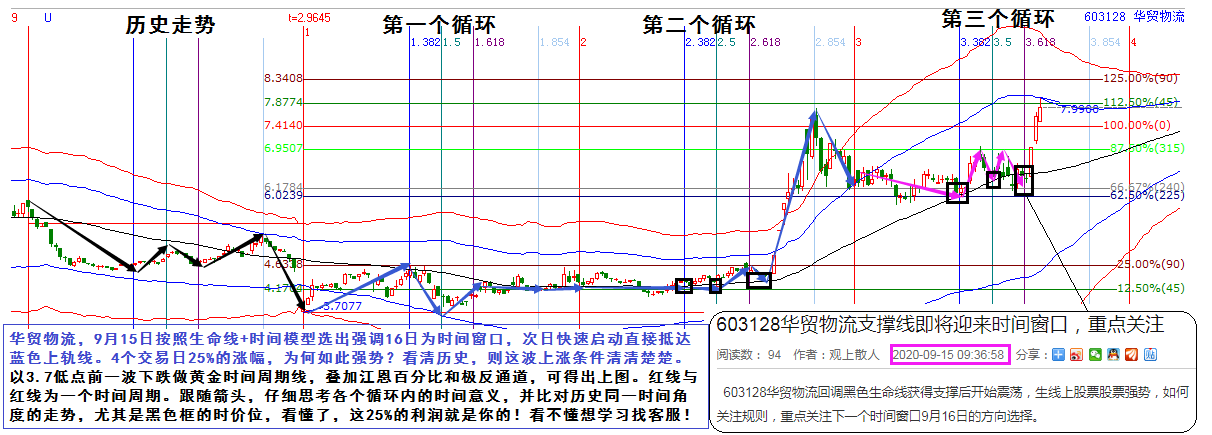 華貿(mào)物流,9月15日按照生命線+時間模型選出強調(diào)16日為時間窗口,次日快速啟動直接抵達(dá)藍(lán)色上軌線。4個交易日25%的漲幅,為何如此強勢?看清歷史,則這波上漲條件清清楚楚。