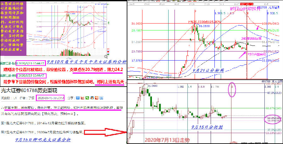 光大證券,股價長期在江恩240度與180度區(qū)間震蕩盤整,遲遲未能啟動就是因為時間不到,而,9月18日時間窗口到達(dá)后,與價格180度支撐形成共振,股價放量上攻。今天遇阻24.21附近,與今天高點只有0.03之差。價格相當(dāng)精準(zhǔn)。時間窗口的分析,可以幫助投資者規(guī)避下跌風(fēng)險,確定變盤窗口,起爆點買賣可以很大提高資金的使用效率。