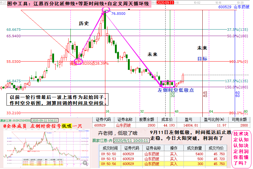 以前一輪行情最后一波上漲作為起始因子,運用時空工具作分析圖,即可測算回調(diào)的時間及空間關(guān)鍵位。對照山東藥玻的圖形去看,自76.85下跌的30天在180度和135度支撐區(qū)間止跌震蕩,疊加倍數(shù)時間再次確認(rèn)轉(zhuǎn)勢信號后構(gòu)成日線低吸信號。按照規(guī)則,9月11日左側(cè)低吸,時間抵達(dá)后止跌走穩(wěn),今日大陽突破,近1.5萬的利潤到手。逢高減持放低成本,是為了更好的把握接下來的利潤,目標(biāo)在哪里,低吸高拋又如何做?繼續(xù)鎖定贏家消息吧!