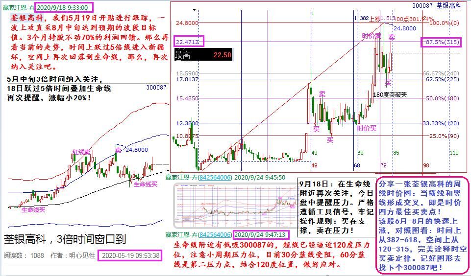荃銀高科,5月19日躍過3倍時間納入關(guān)注,一波上漲給出70%的利潤;9月18日5倍時間再次回落到生命線構(gòu)成新的關(guān)注點,連續(xù)幾日逆勢拉升,短線再次送出20%漲幅。今日盤中結(jié)合空間位置強調(diào)遇阻壓力位,做好應(yīng)對。實則,最高上沖到22.5(315度位置22.47)后,標(biāo)準(zhǔn)回落。時空的標(biāo)準(zhǔn)律動,你去找就會發(fā)現(xiàn)!該股日線圖形3個多月從未動過,一直持續(xù)更新,詳情可以點開下面鏈接學(xué)習(xí):http://liaoba.yjcf360.com/liaoba/300087/1369227.htm