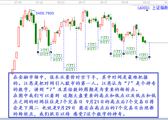 在圖中我們可以看到 近期大盤重要的高點和低點以及低點和低點之間的時間往往是7個交易日 9月21日的高點后7個交易日將會是下周二 也就是9月29日 能否在高點后的7個交易日出現(xiàn)新的轉(zhuǎn)折點,我們拭目以待 感受7這個數(shù)字的神奇。