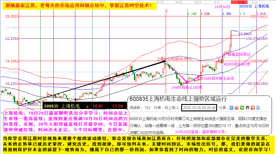 上海機電,10月26日贏家聊吧選出分享學習:時間點站上生命線—看高藍線;藍線到重點強調(diào)10月30日時間點的方向選擇,實則,30號大陽突破藍線打開新空間,今日直接漲停突破紅線,時間還未走完,下個目標哪里,在圖中。