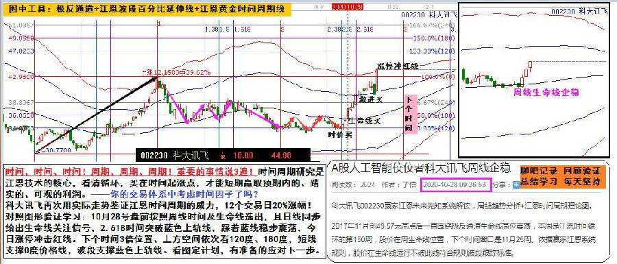科大訊飛再次用實際走勢鑒證江恩時間周期的威力,12個交易日20%漲幅!對照圖形驗證學習:10月28號盤前按照周線時間及生命線選出,且日線同步給出生命線關(guān)注信號,2.618時間突破藍色上軌線,踩著藍線穩(wěn)步震蕩,今日漲停沖擊紅線。下個時間3倍位置、上方空間依次看120度、180度,短線支撐0度價格線,波段支撐藍色上軌線??磮D定計劃,有準備的應對下一步。