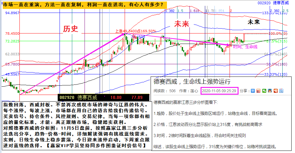 對照德賽西威的分析圖:11月5日盤前,按照贏家江恩三步分析法選出分享,趨勢-價格-時間,詳細解讀強調(diào)有挑戰(zhàn)藍線需求。實則,日線生命線上穩(wěn)步震蕩,今日迎來漲停啟動,下周重點跟進對藍線的選擇。