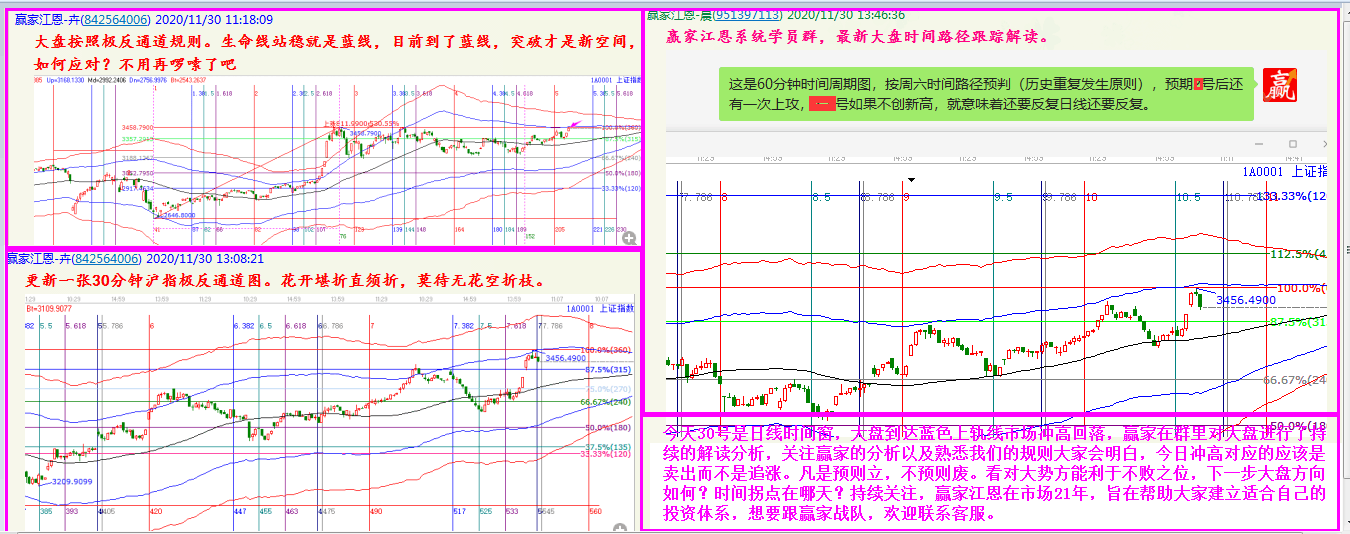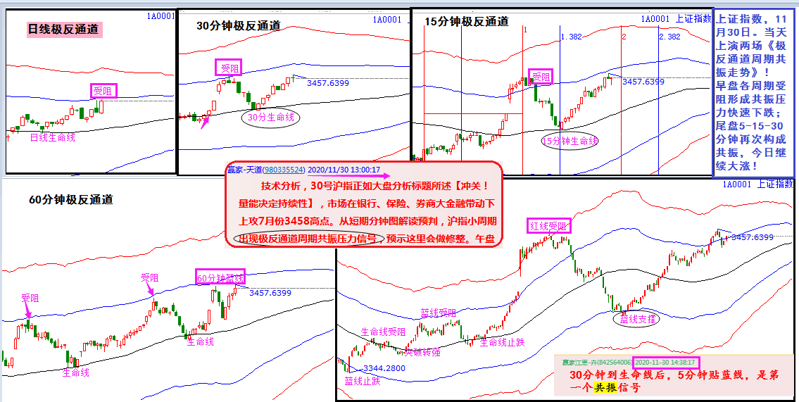 對(duì)照上證指數(shù)日線及日內(nèi)各周期的極反通道匯總圖,11月30日早盤強(qiáng)勢(shì)上攻,各周期全部受阻形成共振賣點(diǎn)——快速下跌;尾盤指數(shù)5-15-30分鐘均回落到支撐線構(gòu)成共振低吸信號(hào),實(shí)則,今日大陽(yáng)報(bào)收!連續(xù)兩場(chǎng)《極反通道周期共振信號(hào)的標(biāo)準(zhǔn)走勢(shì)》,感受到市場(chǎng)的神奇魅力了嗎?