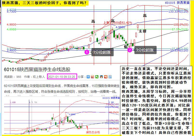 陜西黑貓,本周學(xué)習(xí)標(biāo)的,周一分享符合漲停生命線模型,今日再次揭秘短期時(shí)價(jià)秘密。先看空間,股價(jià)自4.98的回調(diào)在120-135度區(qū)間止跌開漲;對(duì)比前一波一樣是此區(qū)間展開快速行情。同樣的價(jià)格位,同樣的拉升角度,你看到了嗎?時(shí)間呢,最簡單的對(duì)稱模式,兩個(gè)高點(diǎn)卡住了低點(diǎn),等距+3分位+生命線=三天三板!當(dāng)前315度為關(guān)鍵支撐,不破看至下個(gè)時(shí)間點(diǎn)!具體可以自己作圖查看。