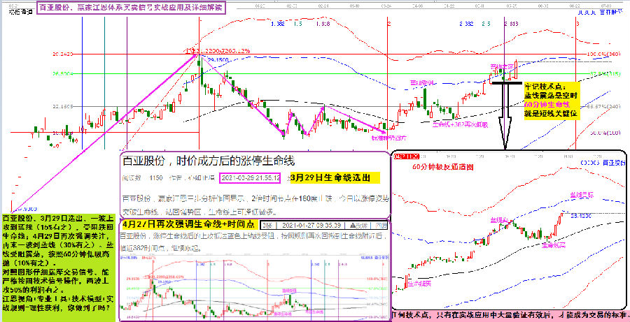 百亞股份,3月29日選出,一波上攻到藍線(15%有之),受阻跌回生命線;4月29日再次強調(diào)關(guān)注,再來一波到藍線(30%有之)。藍線受阻震蕩,按照60分鐘低吸高拋(10%有之)。對照圖形仔細揣摩交易信號,能嚴格按照技術(shù)信號操作,兩波上攻50%的利潤有之。江恩視角+專業(yè)工具+技術(shù)模型+實戰(zhàn)規(guī)則=理性獲利。