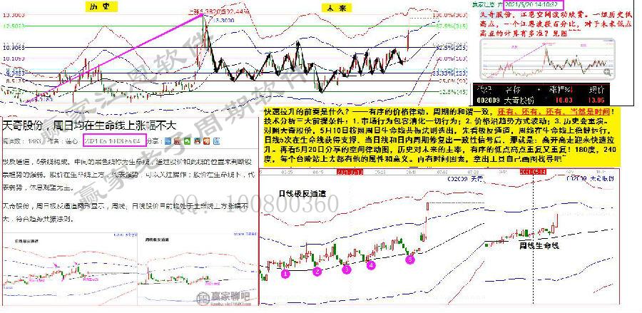對照天奇股份,5月10日按照周日生命線共振法則選出,先看極反通道,周線在生命線上穩(wěn)健運行,日線5次在生命線獲得支撐,當(dāng)日線和日內(nèi)周期修復(fù)出一致性信號后,那就是:高開高走迎來快速拉升。再看5月20日分享的空間律動圖,歷史對未來的主宰,有序的低點高點重復(fù)又重復(fù)!180度,240度,每個臺階站上去都有他的屬性和意義。再有時間因素,拿出工具自己畫圖找尋吧!