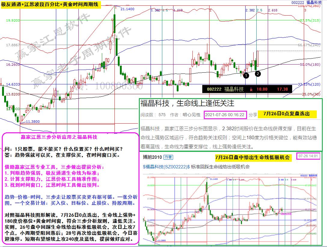 對照福晶科技圖形解讀,7月26日0點選出,生命線上強勢+180度價格位+黃金時間窗,符合三步分析規(guī)則,逢低關(guān)注。實則,26號盤中回踩生命線給出標準低吸機會,次日上攻7個點,小周期受阻回落后;28號再次給出低吸機會,今日喜迎漲停。短期有望繼續(xù)上攻240度及藍線,提前做好應對。