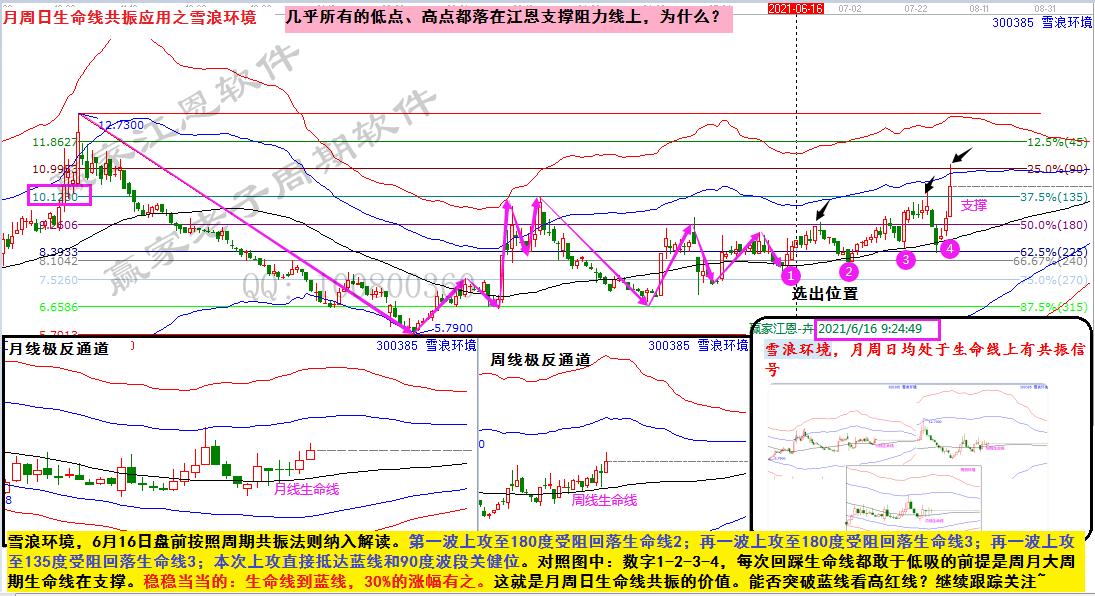 雪浪環(huán)境,6月16日盤前按照周期共振法則納入解讀。第一波上攻至180度受阻回落生命線2;再一波上攻至180度受阻回落生命線3;再一波上攻至135度受阻回落生命線3;本次上攻直接抵達(dá)藍(lán)線和90度波段關(guān)健位。對照圖中:數(shù)字1-2-3-4,每次回踩生命線都敢于低吸的前提是周月大周期生命線在支撐。穩(wěn)穩(wěn)當(dāng)當(dāng)?shù)模荷€到藍(lán)線,30%的漲幅有之。這就是月周日生命線共振的價值。能否突破藍(lán)線看高紅線?繼續(xù)跟蹤關(guān)注~