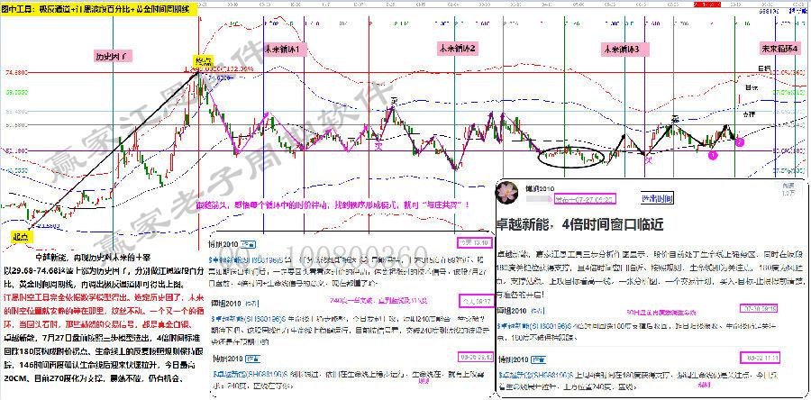 以29.68-74.68這波上漲為歷史因子,分別做江恩波段百分比、黃金時間周期線,再調(diào)出極反通道即可得出上圖?! ?/p>