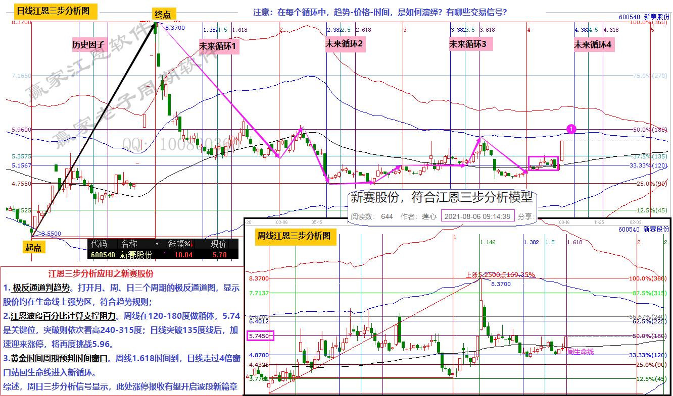 2.江恩波段百分比計(jì)算支撐阻力。周線在120-180度做箱體,5.74是關(guān)鍵位,突破則依次看高240-315度;日線突破135度線后,加速迎來漲停,將再度挑戰(zhàn)5.96。
