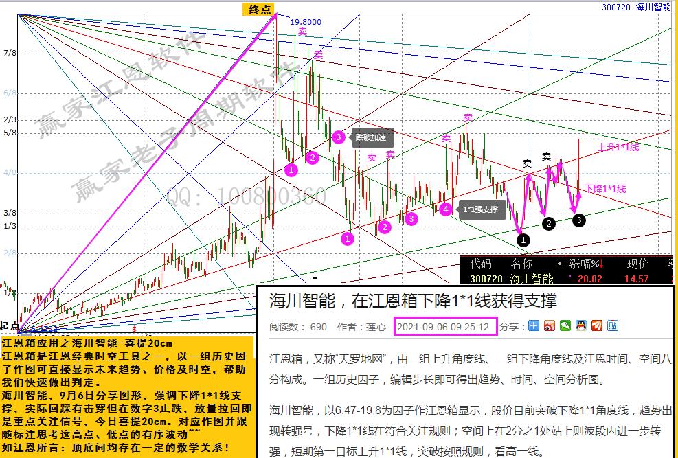 海川智能,9月6日分享圖形,強(qiáng)調(diào)下降1*1線支撐,實(shí)際回踩有擊穿但在數(shù)字3止跌,放量拉回即是重點(diǎn)關(guān)注信號(hào),今日喜提20cm。對(duì)應(yīng)作圖并跟隨標(biāo)注思考這高點(diǎn)、低點(diǎn)的有序波動(dòng)~~