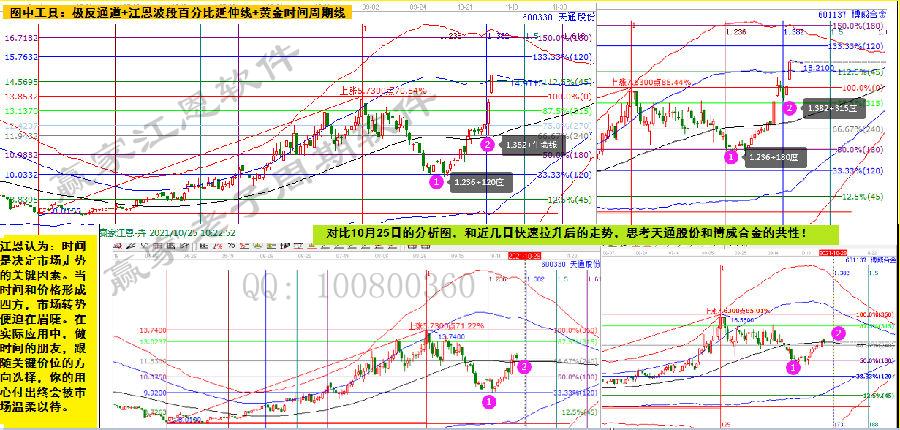 先看天通股份,10月25日分析圖:1.236時(shí)間在120度價(jià)格止跌回升,突破生命線趨勢(shì)轉(zhuǎn)強(qiáng),顯示10月28日是382窗口,實(shí)則28日踩著生命線快速拉升,走出兩板行情。