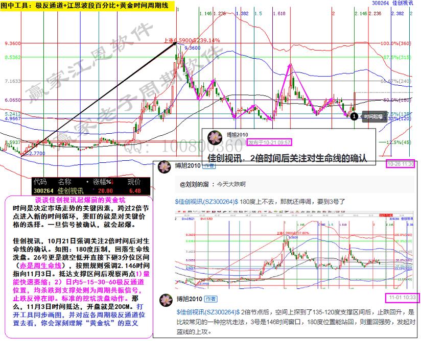 佳創(chuàng)視訊,10月21日強(qiáng)調(diào)關(guān)注2倍時(shí)間后對(duì)生命線的確認(rèn)。如圖:180度壓制,回落生命線洗盤(pán)。26號(hào)更是跳空低開(kāi)直接下砸3分位區(qū)間(亦是周生命線),按照規(guī)則強(qiáng)調(diào)2.146時(shí)間指向11月3日。抵達(dá)支撐區(qū)間后觀察兩點(diǎn)1)量能快速萎縮;2)日內(nèi)5-15-30-60極反通道位置,均殺跌到支撐處則為周期共振信號(hào),止跌反彈在即。標(biāo)準(zhǔn)的挖坑洗盤(pán)動(dòng)作。那么,11月3日時(shí)間抵達(dá),開(kāi)盤(pán)就是20CM。打開(kāi)工具同步畫(huà)圖,并對(duì)應(yīng)各周期極反通道位置去看,你會(huì)深刻理解“黃金坑”的意義。