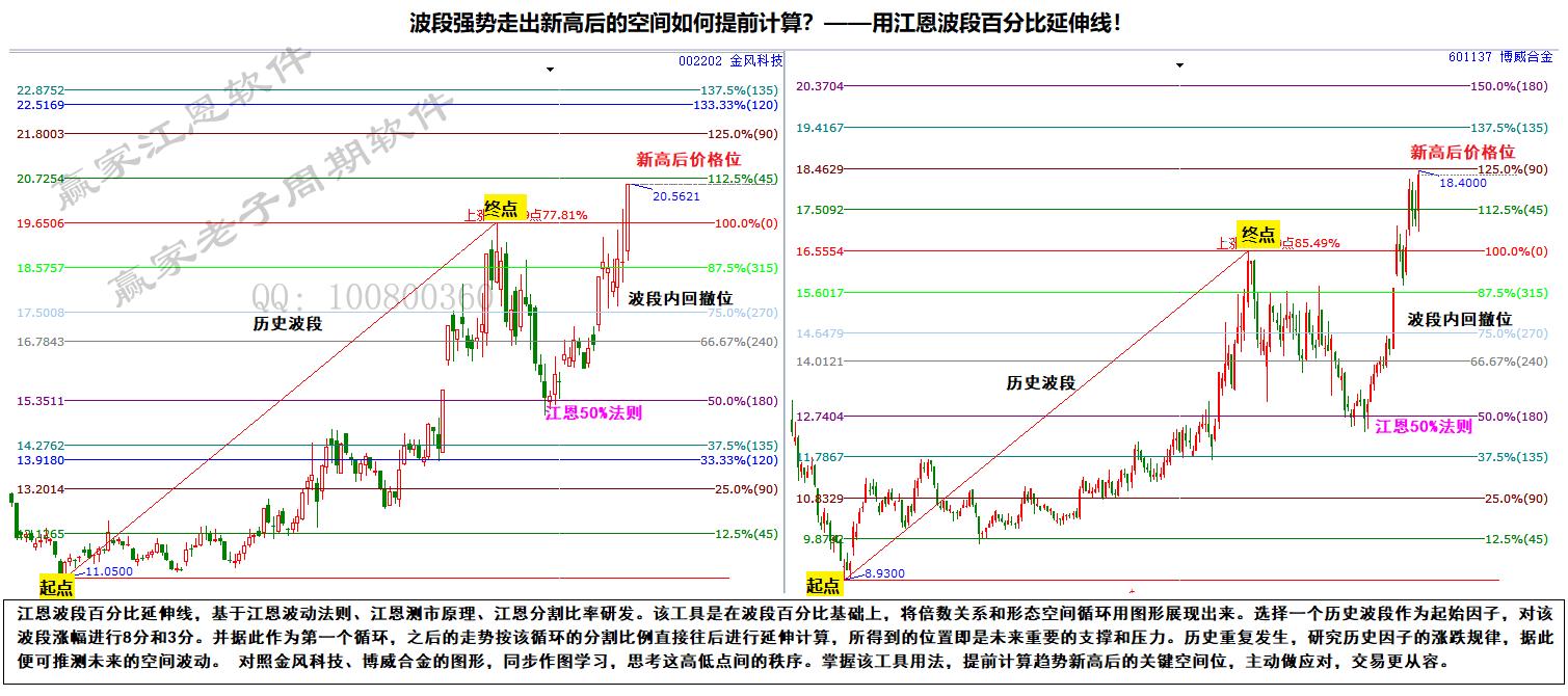 江恩波段百分比延伸線,基于江恩波動(dòng)法則、江恩測(cè)市原理、江恩分割比率研發(fā)。該工具是在波段百分比基礎(chǔ)上,將倍數(shù)關(guān)系和形態(tài)空間循環(huán)用圖形展現(xiàn)出來(lái)。選擇一個(gè)歷史波段作為起始因子,對(duì)該波段漲幅進(jìn)行8分和3分。并據(jù)此作為第一個(gè)循環(huán),之后的走勢(shì)按該循環(huán)的分割比例直接往后進(jìn)行延伸計(jì)算,所得到的位置即是未來(lái)重要的支撐和壓力。歷史重復(fù)發(fā)生,研究歷史因子的漲跌規(guī)律,據(jù)此便可推測(cè)未來(lái)的空間波動(dòng)。 對(duì)照金風(fēng)科技、博威合金的圖形,同步作圖學(xué)習(xí),思考這高低點(diǎn)間的秩序。掌握該工具用法,提前計(jì)算趨勢(shì)新高后的關(guān)鍵空間位,主動(dòng)做應(yīng)對(duì),交易更從容。