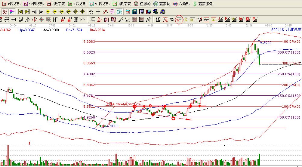 那么他的第一個目標就是他的200% 0度位置6.17的位置。那么我們可以清楚的看到600418到這里然后就開始了震蕩洗盤,因為大盤強勢緣故,600418經(jīng)歷過整理后再一次向300%的位置8.05發(fā)起進攻,這里一躍而過就直接上到了400%的位置,典型的教科書的,大盤好的情況下,可能就是他的3倍位置了。