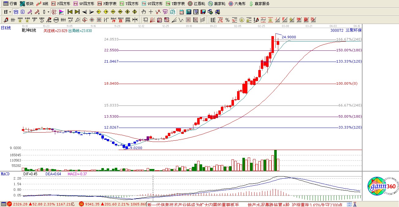 江恩價格百分比9.02做起點作圖可以看出來在其120度180度240度位置100%(0)度位置都進行了震蕩整理。這樣就可以提前算出未來震蕩區(qū)間了。