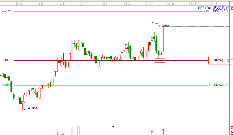 *:江恩價格百分比:依據(jù)江恩價格百分比規(guī)則,(線上支撐,線下阻力,站穩(wěn)一線,看高一線 )002194,,13年2月27日低點處于江恩價格百分比的90度的支撐位置,(90度價格6.06元)