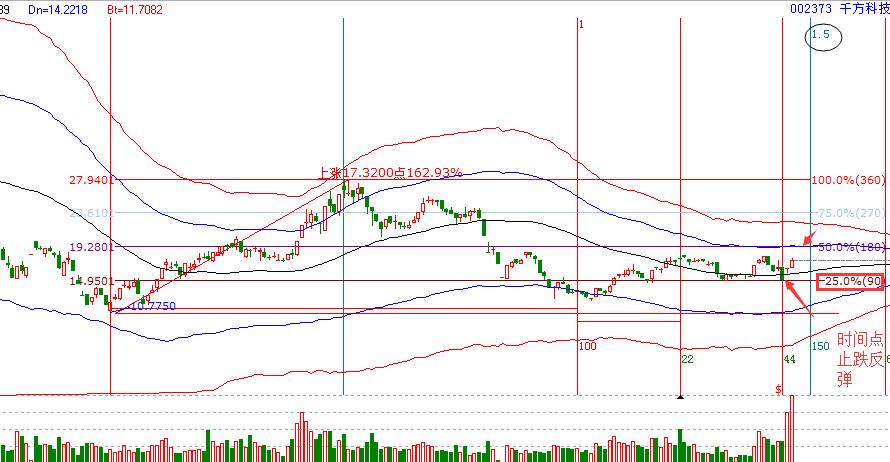 2.工具解析:先看極反通道,市場近期一直處于生命線附近,并在其上震蕩整理,按照生命線的操作規(guī)則,生命線上強勢區(qū)域是可以進場操作的,尤其生命線附近可以買入。價格上,市場多次回落90度支撐,而且,5月11日等距時間窗口該股再次回踩到90度位置,隨后停盤,昨天開盤后回踩到生命線不破,因此判段短期有機會。所以,按照分析,今天就可以低吸買入。買入后生命線不破,即可持股。短期的壓力位就是藍色線,而且,可以看到該位置也是波段百分比180度壓力,是一個價格的共振位。