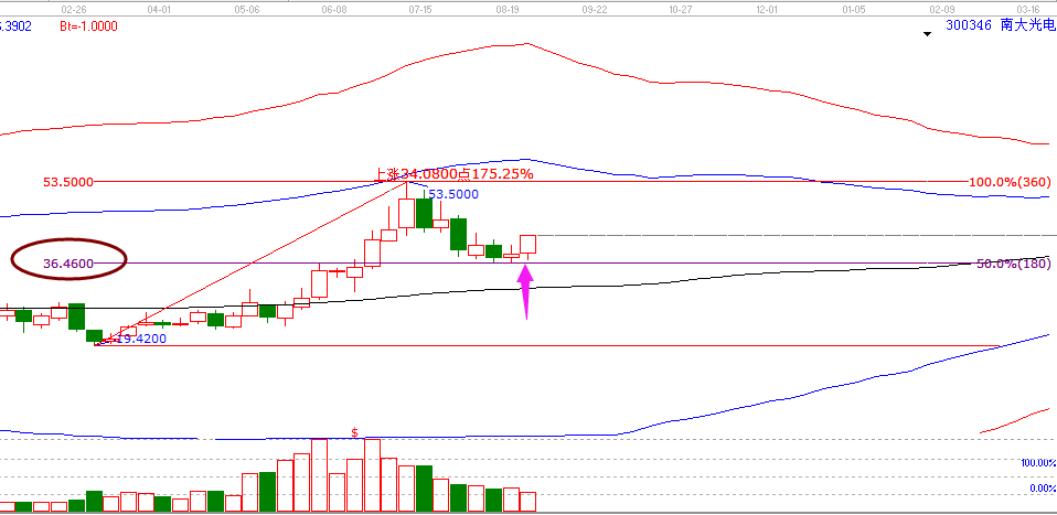 2.工具分析:在江恩理論中,半分位的位置是最重要的,也就是50%的位置,在個(gè)股從上往下回調(diào)至50%的位置,往往會(huì)形成止跌,是重要的支撐位,反之,當(dāng)個(gè)股從下往上反彈至50%的位置,往往會(huì)形成頂部,50%的位置也就是重要的阻力位。按照買在支撐賣在阻力的操作規(guī)則。那么50%支撐就可以買進(jìn),到達(dá)50%阻力位就是賣出的時(shí)候。在當(dāng)前個(gè)股剛好回踩并確認(rèn)了支撐的有效性,就形成了買點(diǎn)。