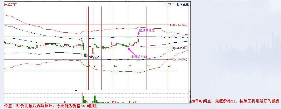 而市場后期的走勢完全印證了前期的分析,選出后,股價回落生命線,并在時間點2月28日啟動上升,快速到達藍色線,結(jié)合分析中的價格,從30.72到34.8左右,幾乎是可以完全把控,在操作的過程中,這波利潤很容易拿到10%左右的獲利空間。在實盤操作中,也曾及時的結(jié)合工具做出提示。