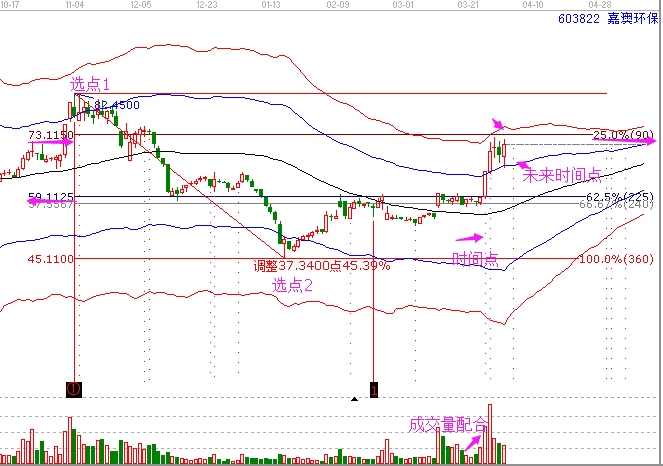 在我們深入了解上面的圖形前,我們來簡單了解一下什么時(shí)間跟的時(shí)價(jià)共振。時(shí)間和價(jià)格的關(guān)系是江恩理論研究的一對經(jīng)典關(guān)系。時(shí)價(jià)共振是指當(dāng)價(jià)格到達(dá)重要重要的位置(壓力或者支撐),時(shí)間窗口到來,確定我們買入或者賣出的操作。下面我們來看上圖中嘉澳環(huán)保603822的走勢。買入的時(shí)候股價(jià)遇到了江恩波段百分比225度位置支撐,下面的虛線是時(shí)間工具江恩輪中輪變盤點(diǎn),整好是買入的那天為時(shí)間變盤點(diǎn),這都成就了這個(gè)買入的操作,當(dāng)然也收獲了到利潤。下面我們來看嘉澳環(huán)保的完整圖形。