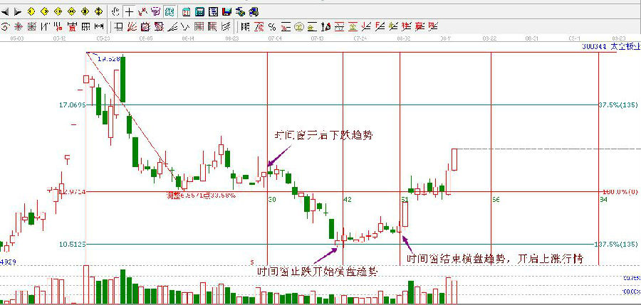 按照上面的理論依據(jù),以及時(shí)間和價(jià)格的意義,我們做出上圖,時(shí)間的意義一目了然。再結(jié)合上價(jià)格波動(dòng),8月1號(hào)為時(shí)間窗,即將發(fā)生趨勢(shì)反轉(zhuǎn),而價(jià)格上也在百分比137.5%價(jià)格支撐位,時(shí)間窗+價(jià)格支撐=買(mǎi)點(diǎn)。因此。8月以來(lái)的上漲是預(yù)期之內(nèi)的表現(xiàn)。
