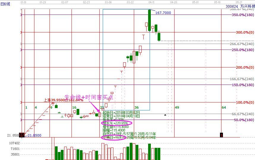 按照時價共振擒妖模型,3月1日萬興科技時間窗和價格支撐出現(xiàn)共振,形成擒妖模型。贏家江恩在3月2日果斷買進,一路持股,截止4月10日高點,共16個交易日,實現(xiàn)翻2倍上漲。