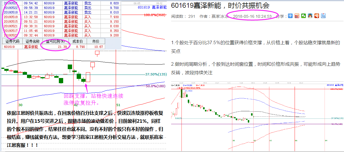 嘉澤新能,5月15號(hào)依據(jù)江恩時(shí)價(jià)共振選出,用戶同步參與,贏家聊吧16號(hào)發(fā)布,參與之后回落江恩價(jià)格百分比50%重要支撐位,止跌并快速以連續(xù)漲停板收復(fù)拉升。用戶在15號(hào)買進(jìn)之后,跟隨市場(chǎng)的波動(dòng)在止跌企穩(wěn)之后聯(lián)系做差價(jià)降低成本,目前盈利21%。