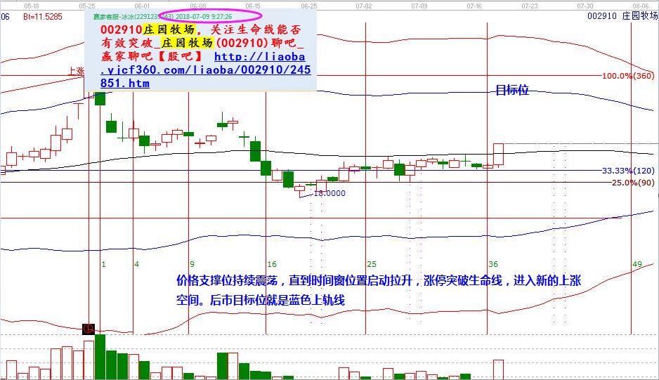 莊園牧場:9號依據時價共振選出,在百分比33.33%和生命線區(qū)間震蕩,截止目前漲幅在12%左右。今天漲停向上突破生命線進入新的上漲空間,后市上漲目標位就是極反通道藍色上軌線位置。