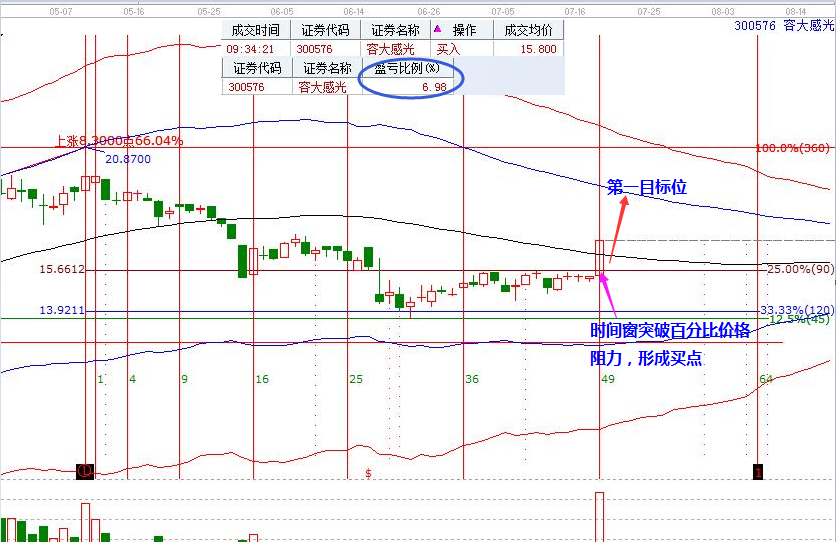 容大感光:18號時間窗位置,向上突破百分比25.%j價格阻力位,阻力轉化為價格支持,符合江恩的價格操作規(guī)則,用戶買進,收獲漲停,截止收盤盈利6個多點,今天向上突破生命線位置,進入新的上漲空間,下一個目標位就是極反通道藍色上軌線位置。