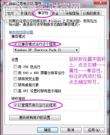 2) 兼容性的問題,win10系統(tǒng)需要設(shè)置兼容性,點(diǎn)擊右鍵打開軟件就不會(huì)提示過期了。方法:鼠標(biāo)放在贏字圖標(biāo)上,點(diǎn)擊右鍵——屬性——兼容性——以兼容模式運(yùn)營和以管理員身份運(yùn)行此程序,兩項(xiàng)前面打勾選中——點(diǎn)擊確定即可。