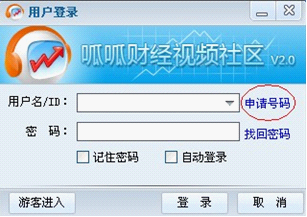 第三步:安裝好后桌面出現(xiàn)"呱呱財(cái)經(jīng)視頻社區(qū)",雙擊,點(diǎn)擊申請(qǐng)?zhí)柎a。申請(qǐng)?zhí)柎a,像QQ一樣,號(hào)碼申請(qǐng)完畢后記住號(hào)碼,然后登陸大廳