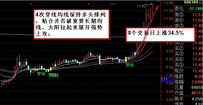 穿線戰(zhàn)法是均線135戰(zhàn)法中經(jīng)典的看漲分析方法之一,通俗講是一根標(biāo)志性的K線穿越3條或4條均線,隨后震蕩后形成均線多頭,展開強(qiáng)勢上攻;