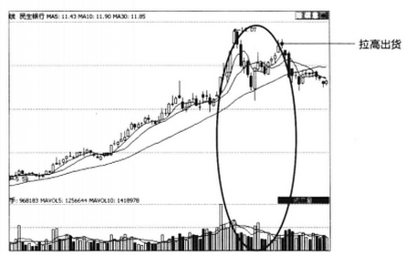 上圖是民生銀行(600016)的日K線圖和成交量,在股價上漲一大段后,主力已拉到目標(biāo)價位,然后快速拉高出貨。