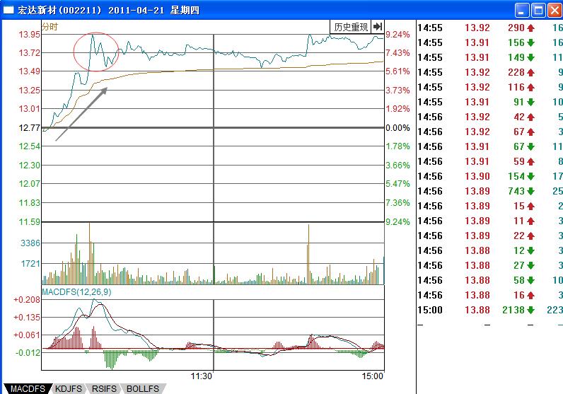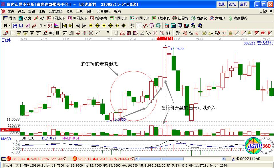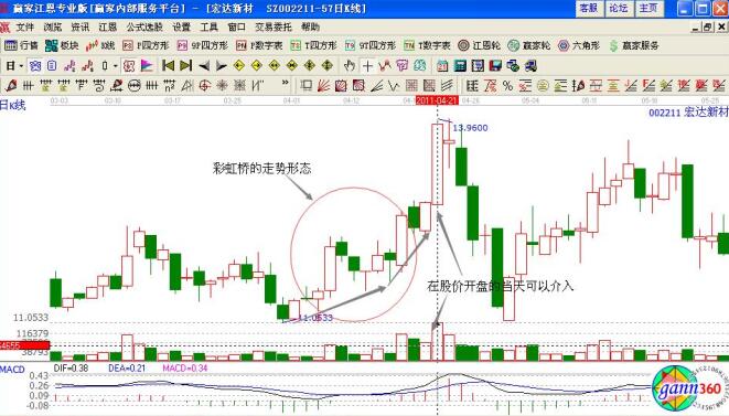 如圖宏達(dá)新材(002211)在2011年4月份的股價走勢變化,股價一直處于明顯的上漲趨勢中,而且在上漲的過程中出現(xiàn)的陽線多于陰線的走勢,4月8日的時候股價開始了一根大陽線的拉升走勢,之后出現(xiàn)的回調(diào)形成了“彩虹橋”的基本走勢形態(tài),對應(yīng)的量能配合比較合理,形成的是量升價漲,價跌量縮的基本走勢形態(tài)。