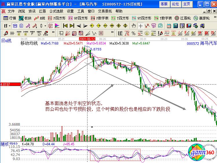 下面我們通過具體的實例進行分析,海馬汽車是一只長期處于弱勢運行的股票,其基本面的消息是,公司地處海南,主營業(yè)務是開發(fā)區(qū)的綜合開發(fā),建設以及管理,而該公司在2001年的是處于虧損的狀態(tài),相應的股價也處于連續(xù)的下跌中,其中虧損的原因是依據國家的改革進行各項資金回歸實際價值,化解資產虛增的潛在因素。
