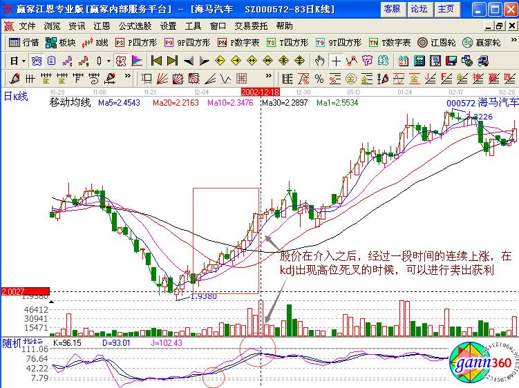 從中可以觀察到該股下跌的趨勢一直延續(xù)到2002年11月27日,而且當天的最低價是在4.20元的位置,股價在當天出現了小陽線的走勢,在12月5日的時候,對應的KDJ指標日線走勢觸及頂部并且有鈍化的跡象出現,所以股價出現了上下震蕩的走勢,而且當天股價的最高價與最低價相差有4.82-4.63=0.19元,這個時候很多的短線投資者都會拋出離場。