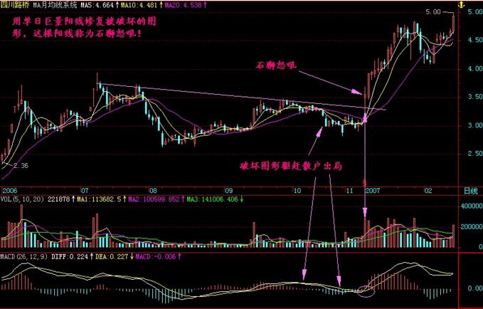 該股在2006年12月到2007年初的股價走勢,前期經(jīng)過一段時間的下跌行情,也就是主力進行洗盤操作的過程中,將散戶驅(qū)趕出局,破壞了下跌的圖形,之后股價經(jīng)過拉升,使用一根單日巨量陽線修復(fù)被破壞的圖形走勢,形成“石獅怒吼”的操作形態(tài),而對應(yīng)的成交量是巨量的形態(tài),macd指標(biāo)中的走勢是金叉買入的操作形態(tài),這個時候股價處于均線的上方運行,均線的走勢是進行買入的信號,所以投資者綜合幾個方面的因素進行分析,是可以進行買入操作等待后市上漲的。