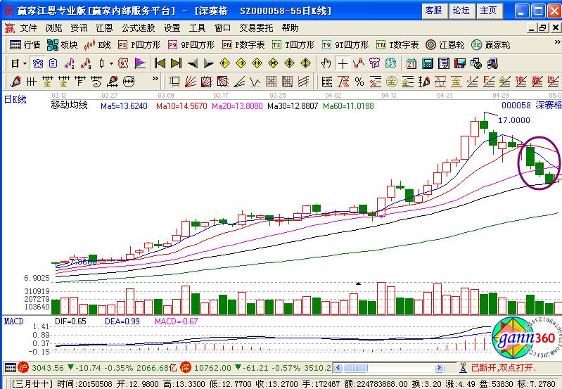 在2015年5月7日的時候,深賽格當(dāng)天收盤是在30日均線上得到支撐,并未跌破,而且當(dāng)時均線呈現(xiàn)的是多頭排列,連續(xù)下跌三天,故當(dāng)時在次日開盤以13元的價位進行買入!在5月12日以15.7元的價位進行賣出!此次交易獲利20.7%!