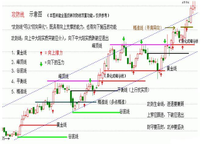 是所有量線的代名詞,但不包含峰谷線,攻防線可攻可守,股價(jià)在其上方,下踩線不破可以介入;中大陽線實(shí)質(zhì)下破要接機(jī)退出;股價(jià)在其下方,上觸線不過要退出,中大陽實(shí)質(zhì)上穿要積極介入;