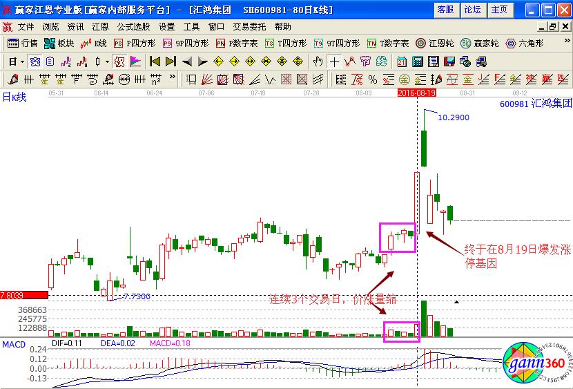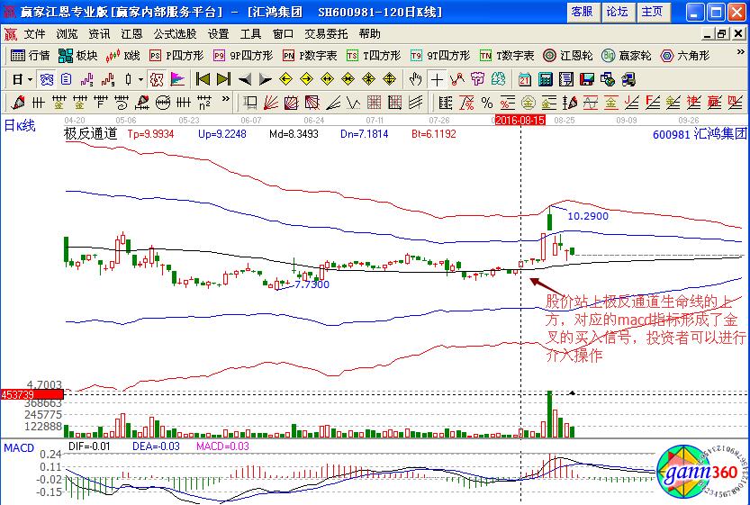 如圖匯鴻集團(tuán)(600981)在極反通道中的走勢形態(tài),在2016年8月份的時(shí)候,股價(jià)一直處于生命線的附近運(yùn)行,類似與橫盤整理的形態(tài)(股票橫盤是什么意思),之后繼續(xù)觀察其股價(jià)的走勢變化,可以看出在8月15日的時(shí)候,股價(jià)站上了生命線的上方,進(jìn)入強(qiáng)勢區(qū)域運(yùn)行,而且對應(yīng)的macd指標(biāo)形成的是金叉買入的操作信號,投資者可以在該位置進(jìn)行買入操作,等待后市的上漲形態(tài)。