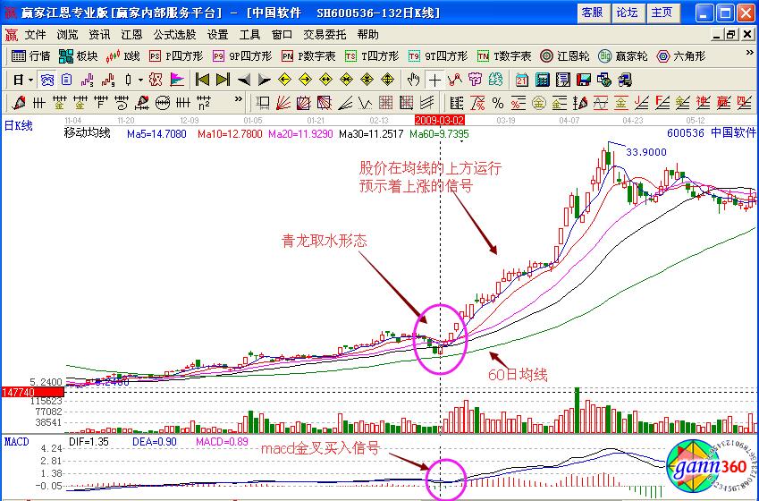 如圖中國軟件(600536)在2009年3月2日的時(shí)候,股價(jià)前期一直處于下跌徘徊的走勢,并形成了青龍取水的形態(tài),也就是牛股龍形,之后股價(jià)在60日均線的附近位置下跌之后,繼續(xù)反彈上漲,并沒有跌破60日均線,之后股價(jià)在均線的上方運(yùn)行,均線形成多頭排列的形態(tài),是一個(gè)強(qiáng)烈的上漲信號(hào),投資者可以在該點(diǎn)位置進(jìn)行買入操作。
