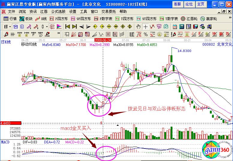 具體的實戰(zhàn)案例如圖北京文化(000802)在2008年6月底的股價走勢,在日K線中形成的是連續(xù)下跌的走勢,6月24日的時候形成了撥云見日與雙山谷停板的形態(tài),并且最后一個漲停板的形態(tài)包含了最大的陰線實體,并且上漲的幅度在5%以上,對應(yīng)的macd指標形成的也是金叉買入的信號,大膽的投資者可以在該位置進行短線介入。