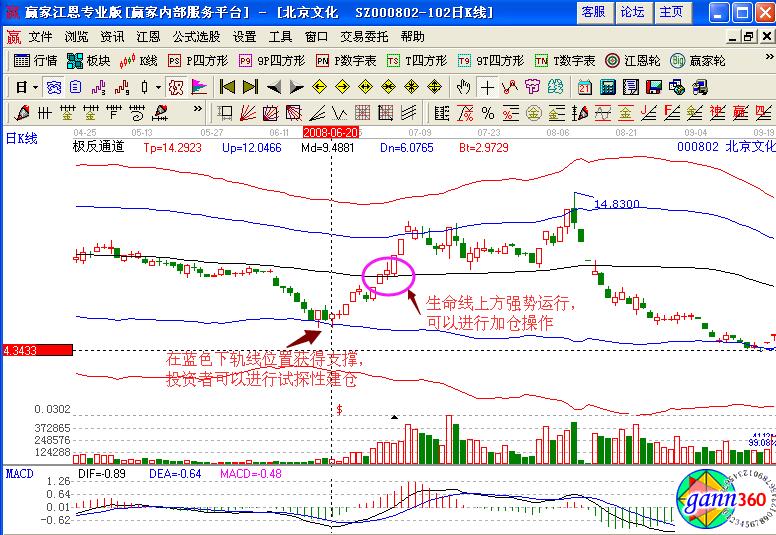如果是在江恩軟件的極反通道中分析該股的買賣點位置,可以發(fā)現(xiàn)在2008年6月20日的時候,股價在藍色下軌線的位置獲得了上漲的支撐,并且K線形成的是小陽線,沒有完全覆蓋前面的陰線,量能變化較小,投資者可以進行試探性的建倉操作,之后股價一路上漲,在7月初的時候向上突破生命線,進入強勢區(qū)域運行,投資者可以適當?shù)倪M行加倉操作。